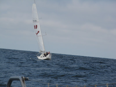 Po całej nocy w kokpicie, o poranku, do mety było 25 mil, prędkość pod spinakerem wynosiła powyżej 5 węzłów a humor w załodze był dobry. Niestety wiatr szybko osłabł, potem zmienił kierunek na SE. Prędkość spadła, zaraz po niej nastrój, wyszło słońce i zaczęło przypiekać, to były najtrudniejsze, długie godziny, ale powoli zbliżaliśmy się do portu (ja i Skoczek).