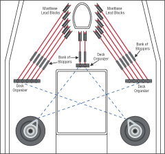 Aby najefektywniej wykorzystać oba kabestany zamocuj organizery za stoperami, tak by liny mogły być skierowane na kabestan na drugiej burcie. Ta technika jest powszechnie stosowana na łódkach niestandardowych, budowanych na zamówienie, gdzie liny regulacji idą wprost do rufy do stoperów, ale może być stosowana również z powodzeniem, na łódkach seryjnych, na których połowa linek poprowadzona jest na jedną, a połowa na drugą stronę nadbudówki.
